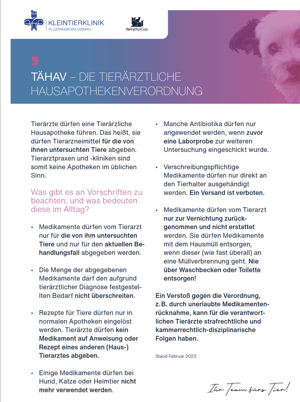 Alle Änderungen, die die Medikamentenabgabe in der Hausapotheke der Kleintierklinik in Ludwigsburg-Oßweil betreffen, haben wir Ihnen im angehängten PDF zusammengestellt.
